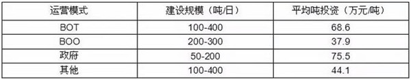 从不同运营模式来看,相对政府投资而言,BOT、BOO模式建设成本明显更低,且由于很多小规模的处理设施采用政府投资或BOT模式建设,导致这两种模式的平均吨投资大幅高于BOO模式。